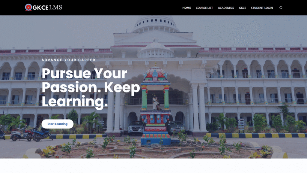 A dedicated Learning Management System (LMS) for GKCE students, providing online courses, resources, and assessments through an interactive and user-friendly platform.