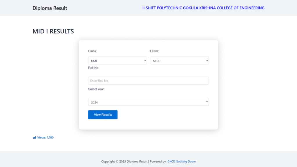 A digital results management system for GKCE, allowing students to securely access mid-term marks and academic performance online in a structured and user-friendly way.