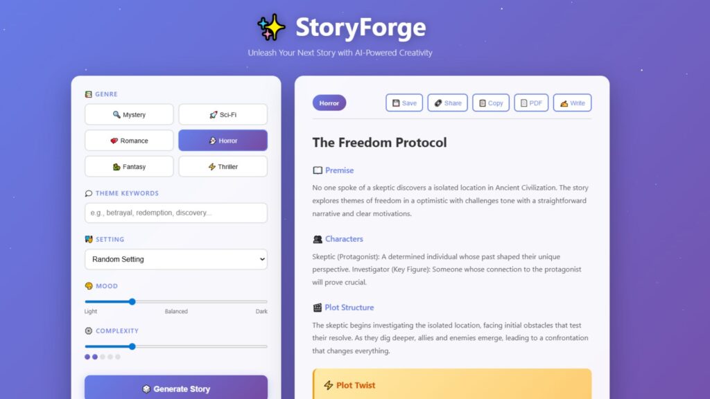 An interactive AI-powered story generator built with vanilla JavaScript, featuring dynamic story generation, multiple genres, customizable parameters, and an intuitive UI with dark mode support.