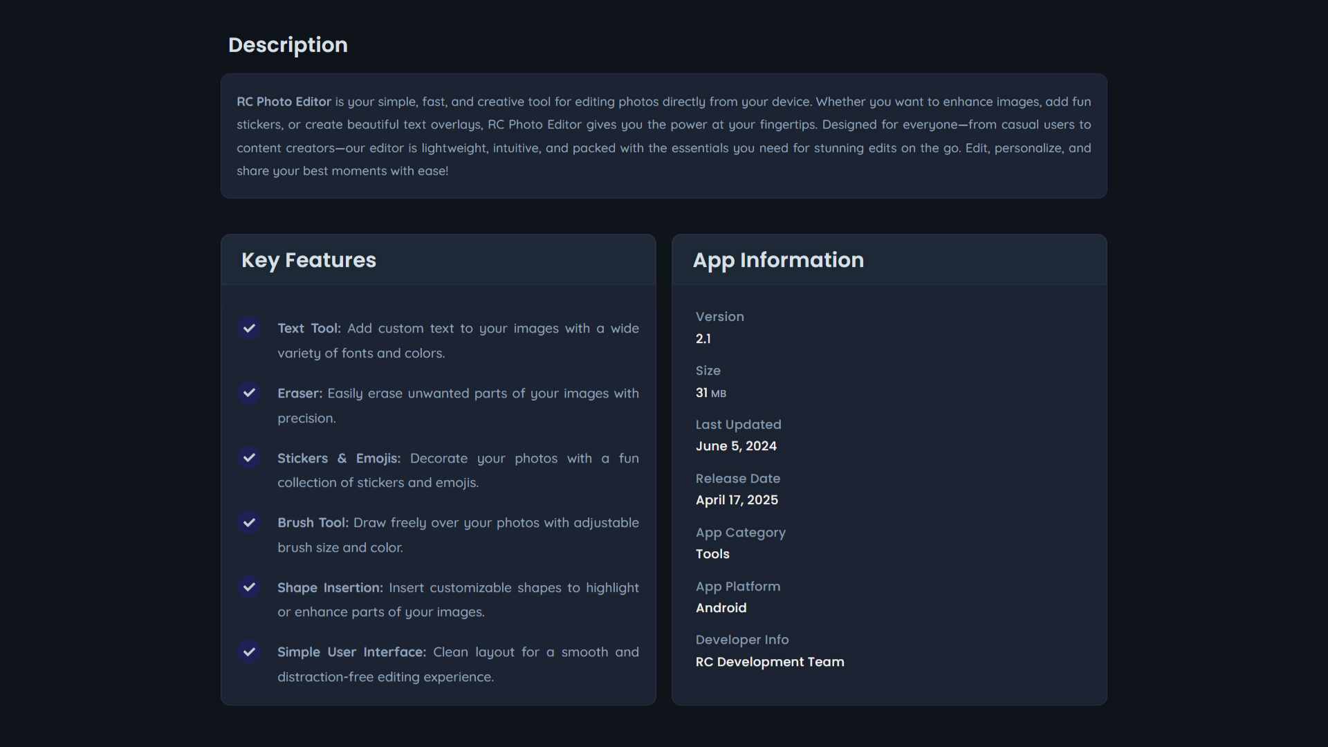 Whether it’s productivity tools to streamline workflows, engaging games for entertainment, or creative utilities to bring ideas to life, RC AppStore delivers a wide variety of curated apps. Our mission is simple: to make high-quality apps accessible, enjoyable, and secure for everyone.